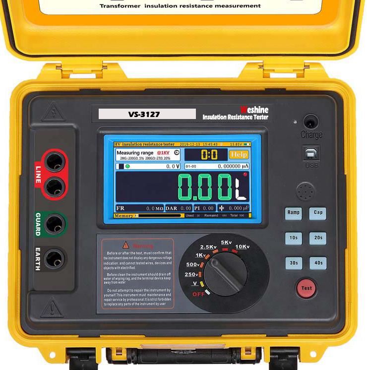 VS-3127 VS-3127Transformatorun İzolyasiya Testi30 TΩ maksimum müqavimətlə 15 kV-a qədər sınaq gərginliyinə qədər dəqiq izolyasiya müqavimətinin ölçülməsini həyata keçirmək imkanı təklif edir. Müqavimət ölçmə dəqiqliyi 1 MΩ-dan 3 TΩ-a qədər ± 5 % təşkil edir! Kommunal xidmətlər və xidmət şirkətləri üçün VS-3127 çevikliyi və gələcəyi yoxlamaq qabiliyyəti ilə hərtərəfli test cihazıdır. Weshine VS-3127 işlədiyiniz yerdə işləmək üçün nəzərdə tutulub. Çıxış nominal gərginliyi maksimum 7 dişliyə çatır (250V,500V,1KV,2.5KV,5KV,10KV,15KV). Maks qısaqapanma cərəyanı 7mA İzolyasiya müqavimət testi (IR), polarizasiya indeksi testi(PI), dielektrik udma nisbəti testi (DAR). Ramp test rejimi (RAMP), filtrlənmiş müqavimət test rejimi (FR). * Tutum Testi (Cap.). Gərginlik monitoru funksiyası, ölçülmüş canlı gərginliyi avtomatik olaraq izləyir
